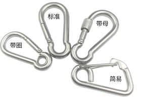 安全鉤的結構主要有彈簧舌自動復位式和自鎖式兩種。 D型安全鉤由鉤體,鎖壁兩部分構成,開合機構為彈簧舌自動復位式,鎖壁部分有扭轉自鎖和螺紋手鎖兩種保險結構設計,自鎖結構鎖壁上裝有旋轉壓縮彈簧,鎖壁套能夠自動復位并鎖緊,手鎖結構鎖壁上有螺紋,旋轉鎖壁套可打開和鎖緊安全鉤。
